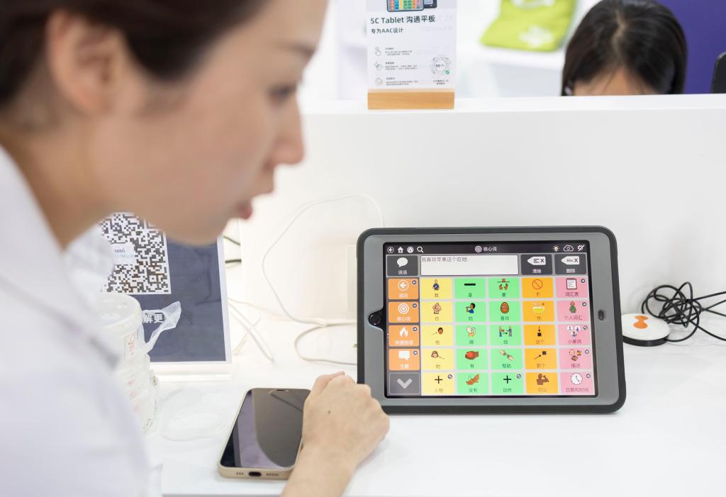 5月21日,在2023中国国际福祉博览会上,一名工作人员演示SC Tablet沟通平板。这款设备可供自闭症人群通过点选平板的各种表情符号表达需求,实现与家人的沟通交流。