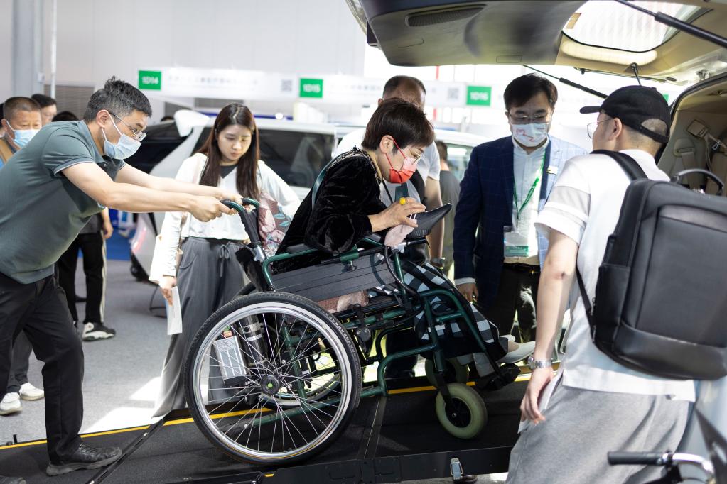 5月21日,在2023中国国际福祉博览会上,参观者体验福祉汽车。福祉车专门为行动不便人群设计,为坐轮椅的乘客提供了升降平台,汽车座椅也可伸出车外,方便乘客上下车。