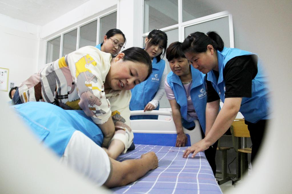 在石家庄市元氏县诚悦家政养老护理课上,老师给学员讲授床铺整理与病患照顾相关知识。新华社记者 王昆 摄