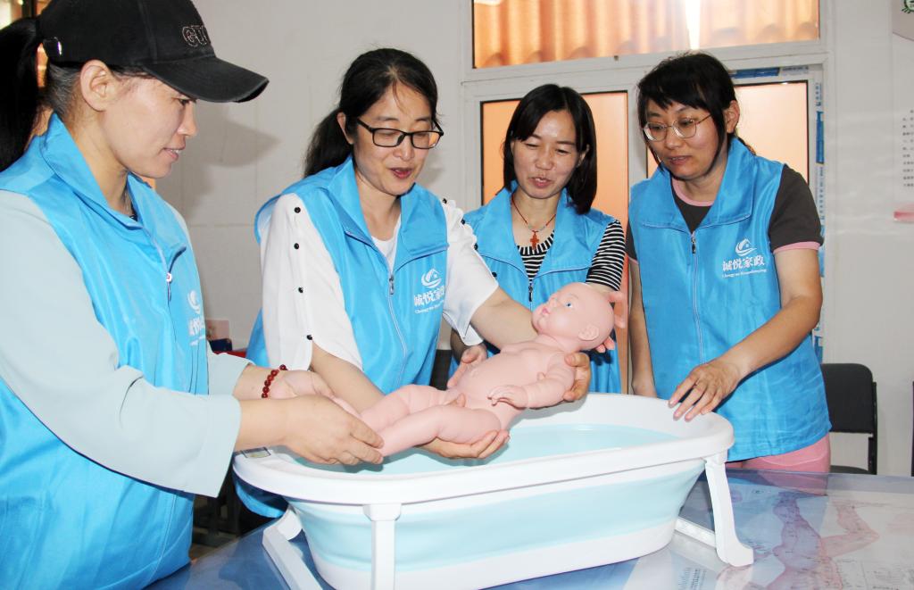 在石家庄市元氏县诚悦家政育婴课上,学员学习如何给婴儿洗澡。新华社记者 王昆 摄