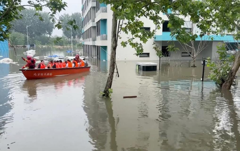 北京市通州区、东城区、西城区四个消防救援支队,80余名消防救援人员驾驶冲锋艇深入房山区琉璃河镇平各庄村的临时安置点。