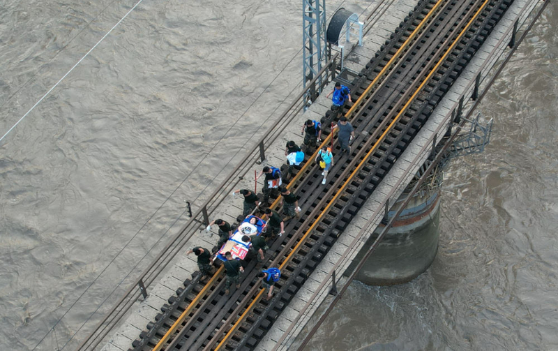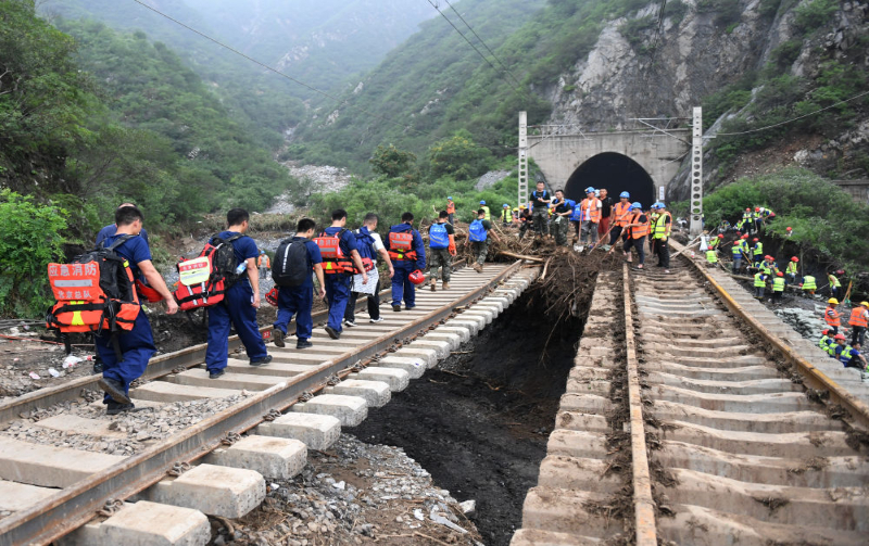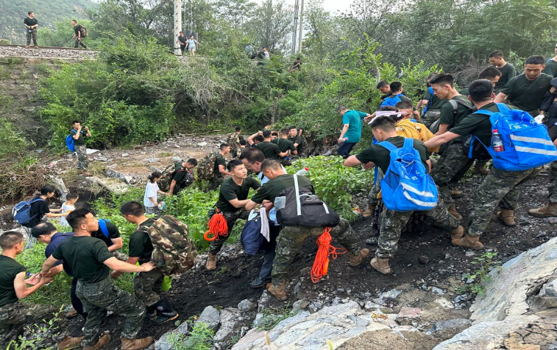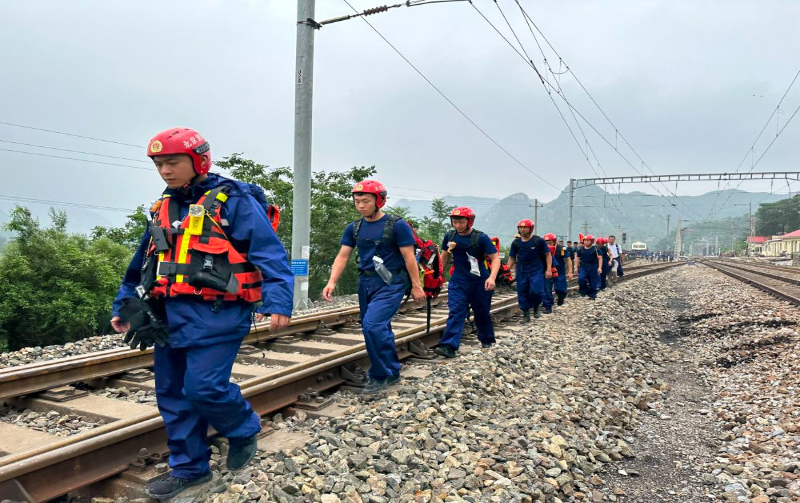 8月2日12时,记者跟随武警北京总队机动第三支队、北京消防救援部门、门头沟中医院等单位组成的应急救援队伍,从门头沟区斜河涧火车站出发,徒步14公里山路,挺进Z180次列车旅客滞留地安家庄村。