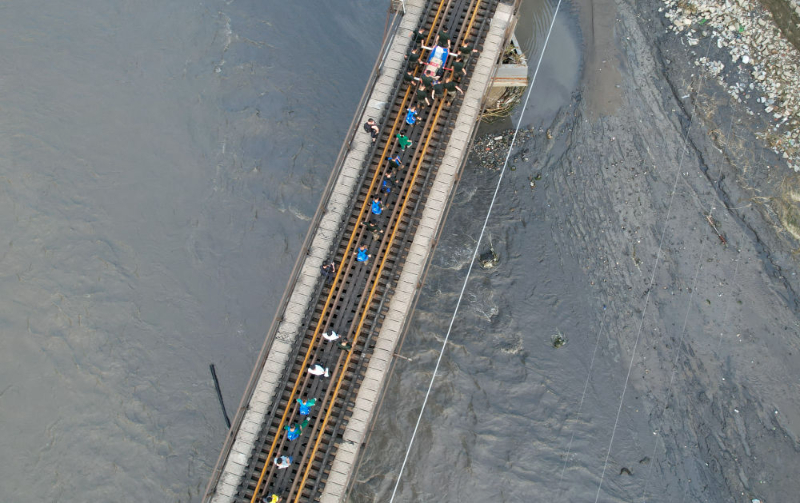 经过永定河上的铁路桥,面对着滚滚河水,武警战士怀里的小朋友说:“叔叔,我有点害怕。”