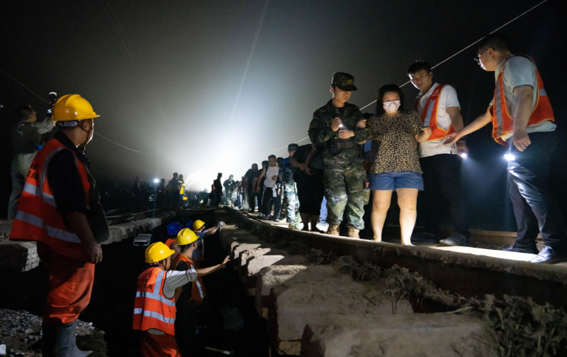 8月2日,Z180次滞留旅客在武警北京总队机动第三支队官兵的帮助下徒步前往转运客车。新华社记者 王艳刚 摄