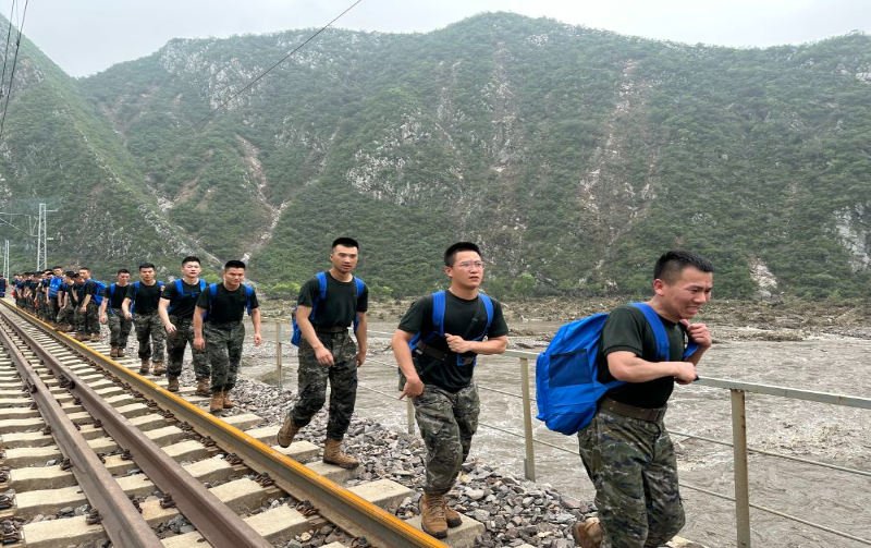 经过1小时休整,转运行动正式开始。15时30分,武警官兵与滞留旅客沿铁路向落坡岭火车站前侧7号隧道5公里处徒步前进。