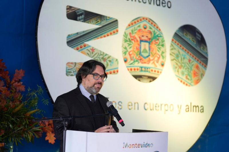 2024年5月29日,乌拉圭蒙得维的亚市长毛里西奥·苏尼诺在巴特列公园举行的雕塑作品《问道》揭幕仪式上致辞。新华社发(尼古拉斯·塞拉亚摄)