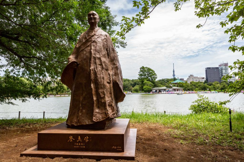 这是2022年7月20日在日本东京上野公园“不忍池”湖畔拍摄的鉴真铜像。新华社发(山崎裕一摄)