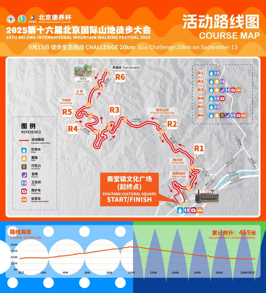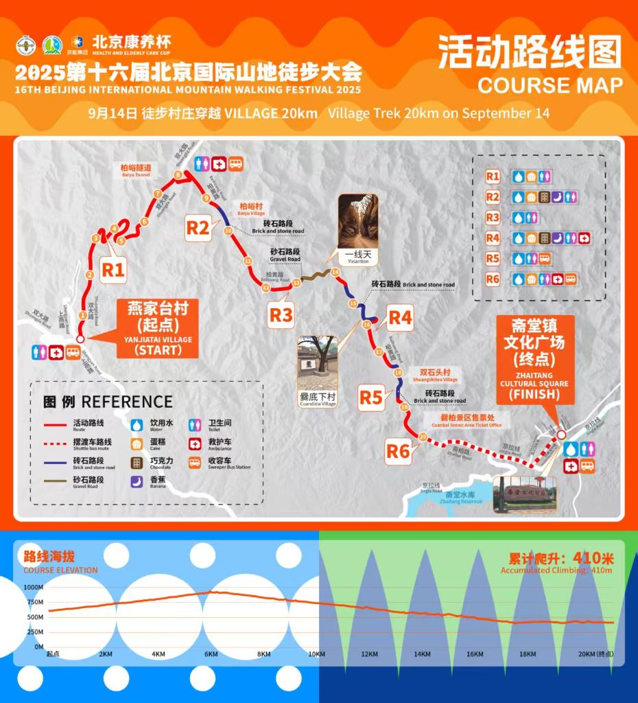 9月13日,开启的徒步生态挑战路线设置有20公里和10公里两个长度。其中,20公里路线从斋堂文化广场出发,沿斋北路至千年古刹灵岳寺折返。10公里路线将田园风光与红色记忆结合,途径宛平抗日烈士纪念碑,途中约1公里的山石路段更增添了徒步的趣味性与挑战性。