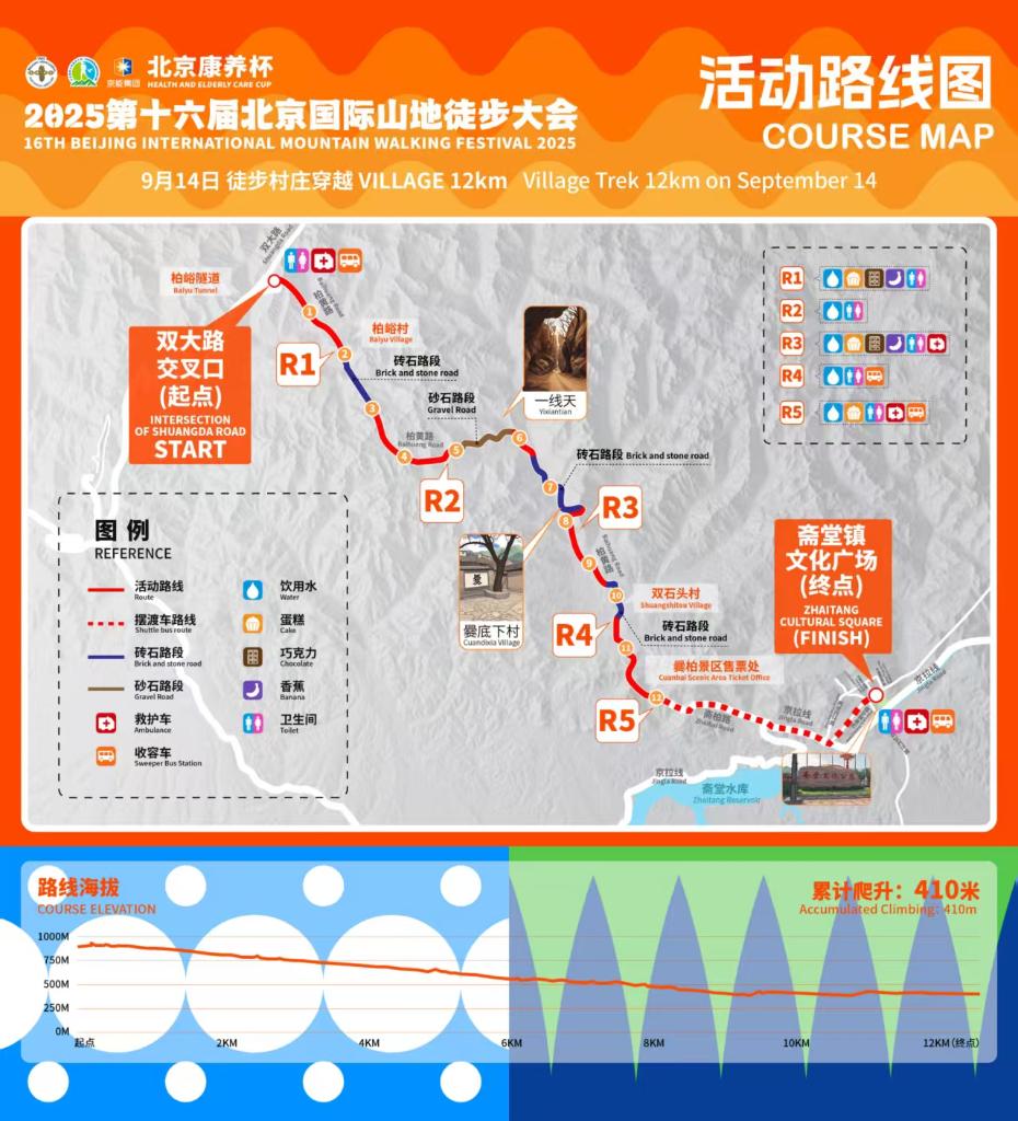9月14日,徒步村庄穿越路线也设有20公里和12公里两个长度,聚焦 “生活文化”体验。其中,20公里路线从燕家台村出发,串联柏峪村、爨底下村、双石头村等古村落,途经“一线天”等自然奇景,让徒步者在群山环抱中感受爨柏景区的人文气息;12公里路线则途径古村核心路段,参赛人员沿途可品鉴双合盛精酿、门头沟咯吱等特色美食,沉浸式体验京西古村的生活韵味。
