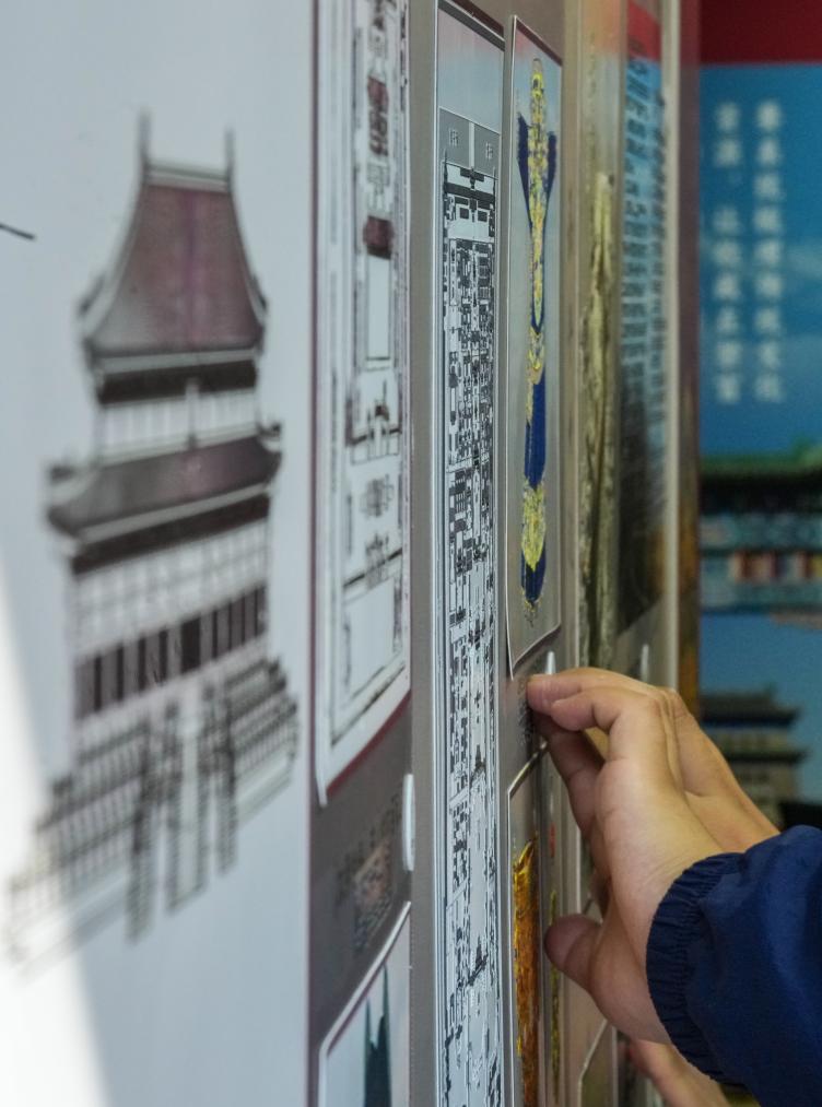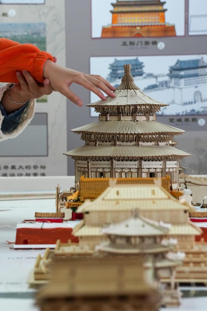 10月13日,视障人士在发布会后,触摸北京中轴线建筑模型。