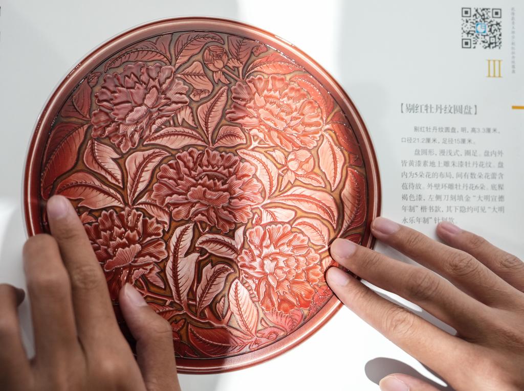 10月13日,视障人士在发布会后,欣赏无障碍版《触摸故宫珍宝》中的剔红牡丹纹圆盘。