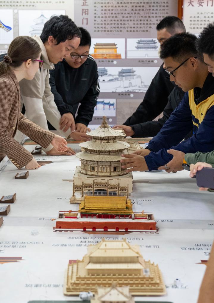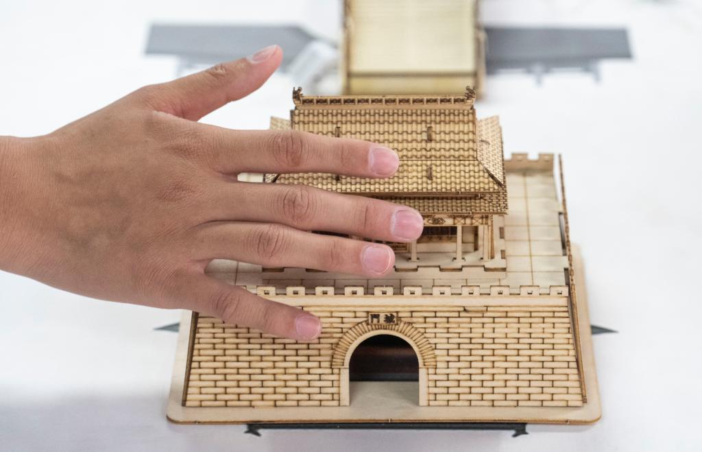 10月13日,视障人士在工作人员帮助下,触摸北京中轴线建筑模型。