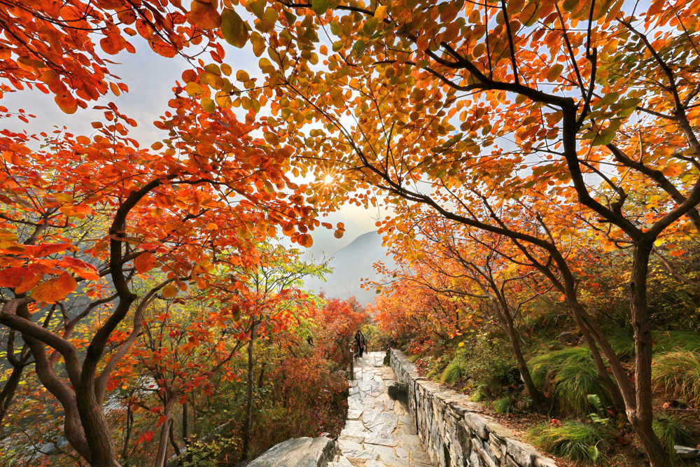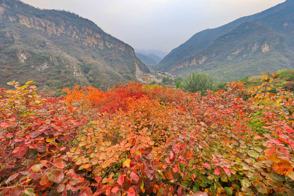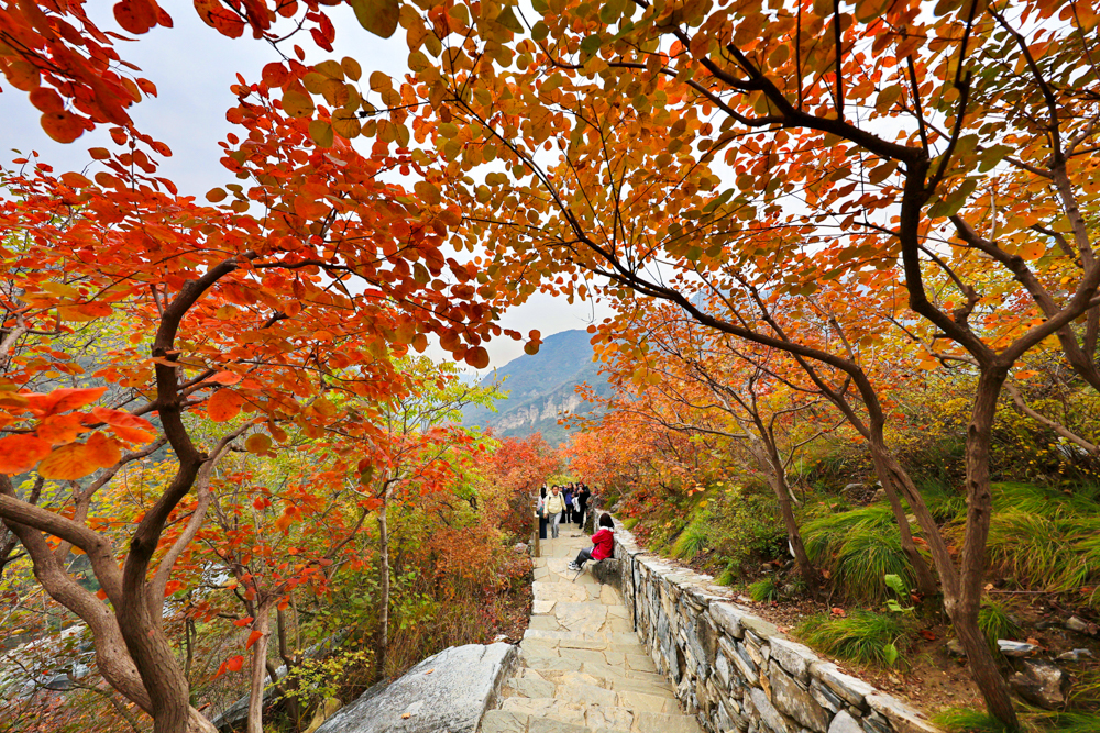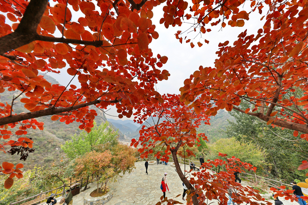 深秋时节,位于北京市房山区的坡峰岭景区进入红叶最佳观赏期。包括黄栌、元宝枫等品种在内的十余万株红叶植物吸引了众多游客登高赏红。
