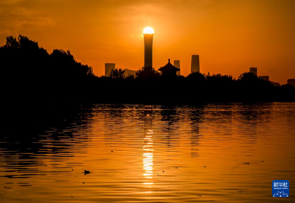 11月10日清晨,北京上空晨曦微露,霞光满天。中国尊、望海楼等地标建筑在晨光中与什刹海光影交错。