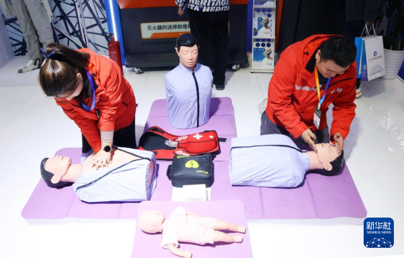 11月18日,工作人员在展览现场向观众演示紧急救护方法。