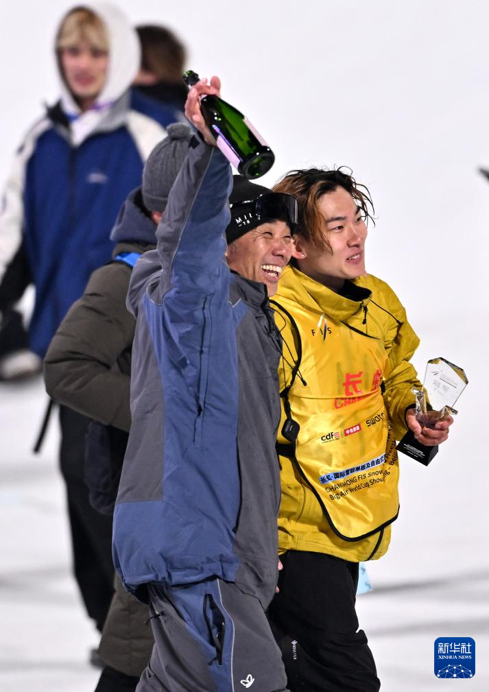 12月6日,冠军中国选手苏翊鸣(右)与教练佐藤康弘在颁奖仪式后庆祝。新华社记者 陶希夷 摄