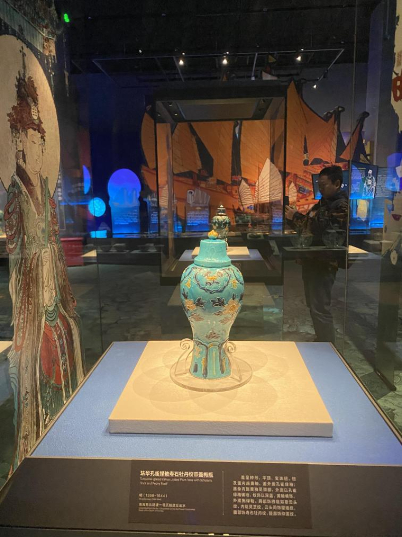 堆塑、镂空、刻划……多件南海西北陆坡一号沉船遗址出水的珐华器陈列在独立展柜里,色彩鲜明,器物表面图案立体感十足。