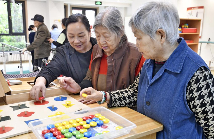 2025年10月17日,老人们在北京市朝阳区来广营区域养老服务中心福寿苑养老公寓内玩智力游戏。新华社记者 李欣 摄