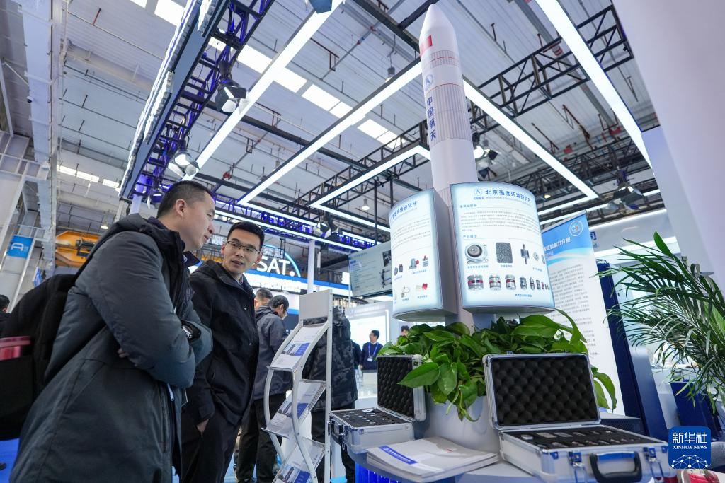 1月23日,观众在2026北京国际商业航天展的北京强度环境研究所展台参观展出的火箭大街商业航天共性试验平台模型。