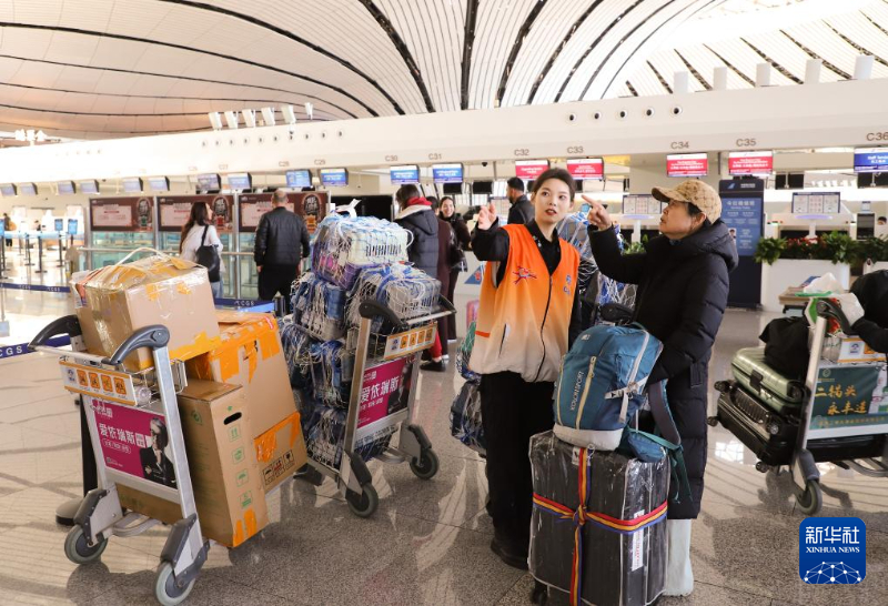 2月2日,北京首都国际机场旅客服务中心工作人员为旅客提供指引、咨询等服务。