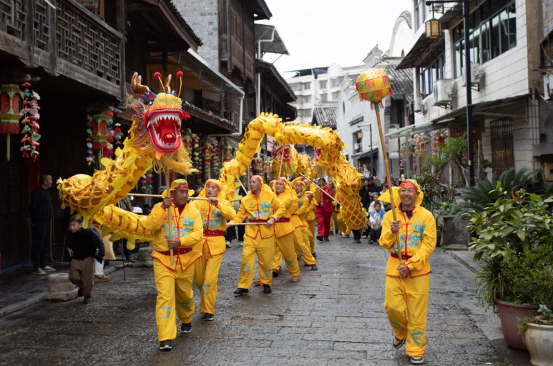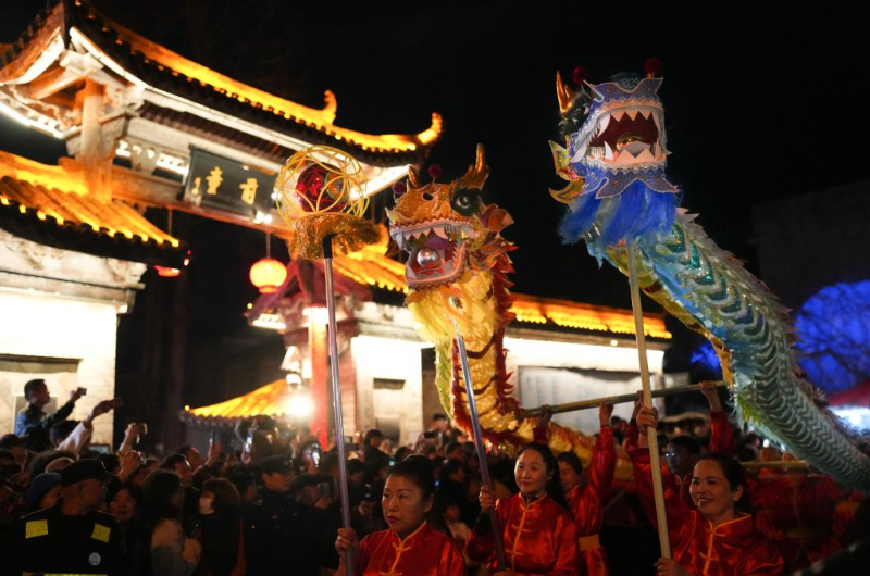 3月2日,浙江省宁海县前童古镇举行传统元宵行会,舞龙队在街头巡游。新华社记者 翁忻旸 摄