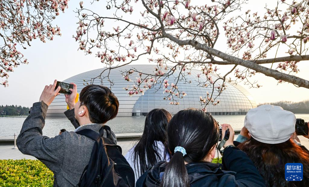 3月12日,摄影爱好者在国家大剧院旁拍摄玉兰花。