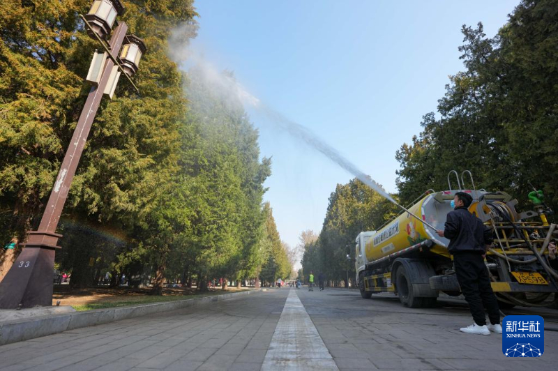 3月15日,在北京地坛公园,工作人员使用添加了花粉控制剂的水对柏树进行喷淋。