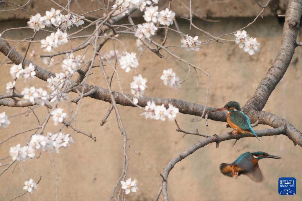 3月23日,在北京市颐和园拍摄的桃花和翠鸟。