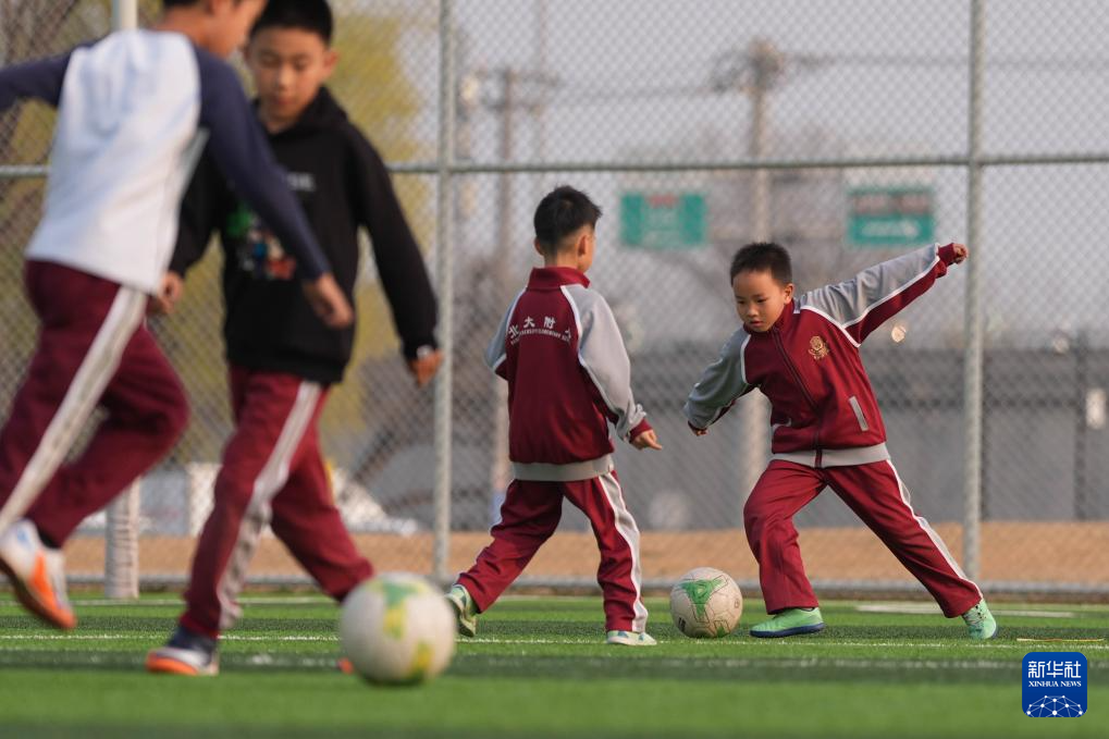 3月23日,北京大学附属小学肖家河分校的学生在北京市海淀区“肖家河·绿动天地”足球场参加课后足球兴趣社团。