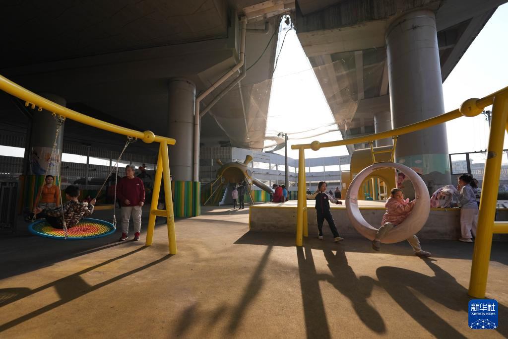 3月19日,孩子们在“天宁寺桥下活力空间”儿童游乐区玩耍。