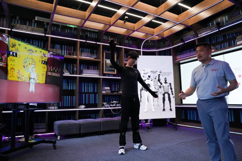 在北京石景山区中关村科幻产业创新中心,工作人员展示动作捕捉技术。(郑焕松 摄)