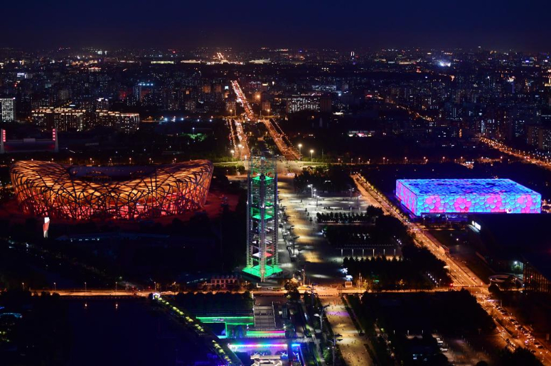 国家体育场“鸟巢”(左)与国家游泳中心“水立方”夜景